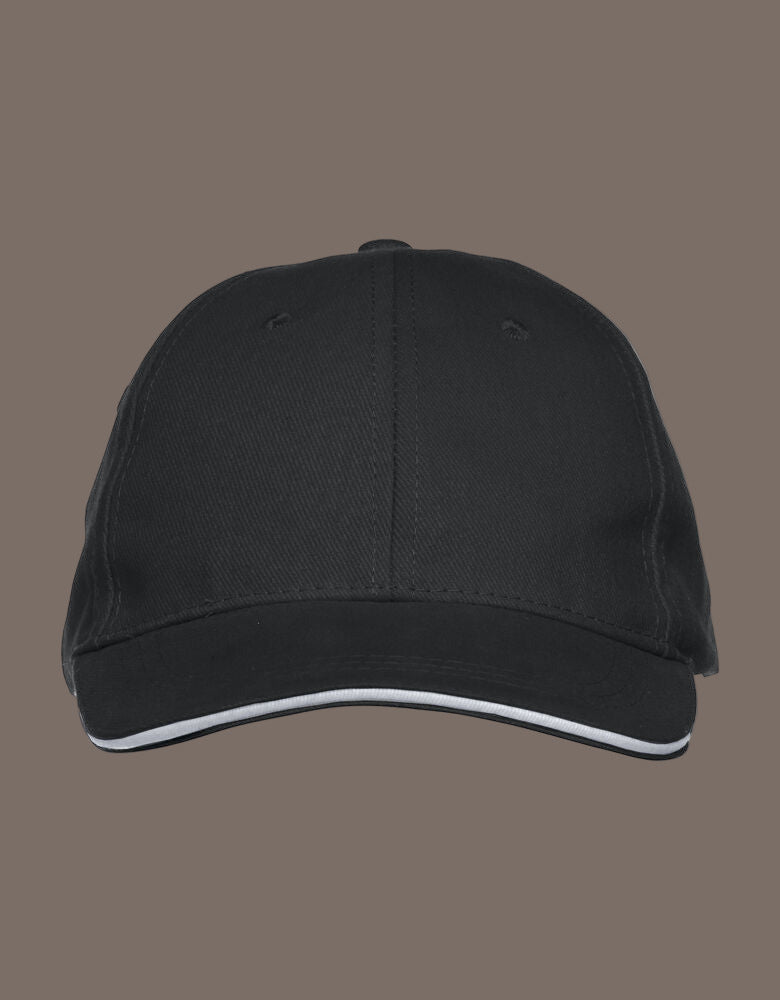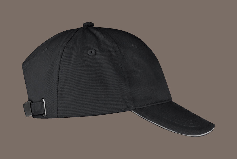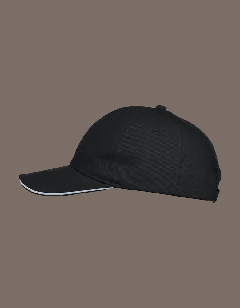 Keps i borstad bomullstwill med delvis kontrastfärgad skärm, “sandwich piping" och justerbart mässingspänne.
